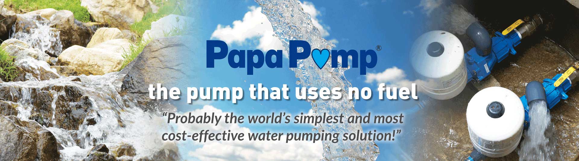 "With no moving mechanical parts, the award winning Papa Ram Pump is probably the world's simplest and most cost effective water pumping solution, delivering water 24/7 without the need for electricity or fuel!"